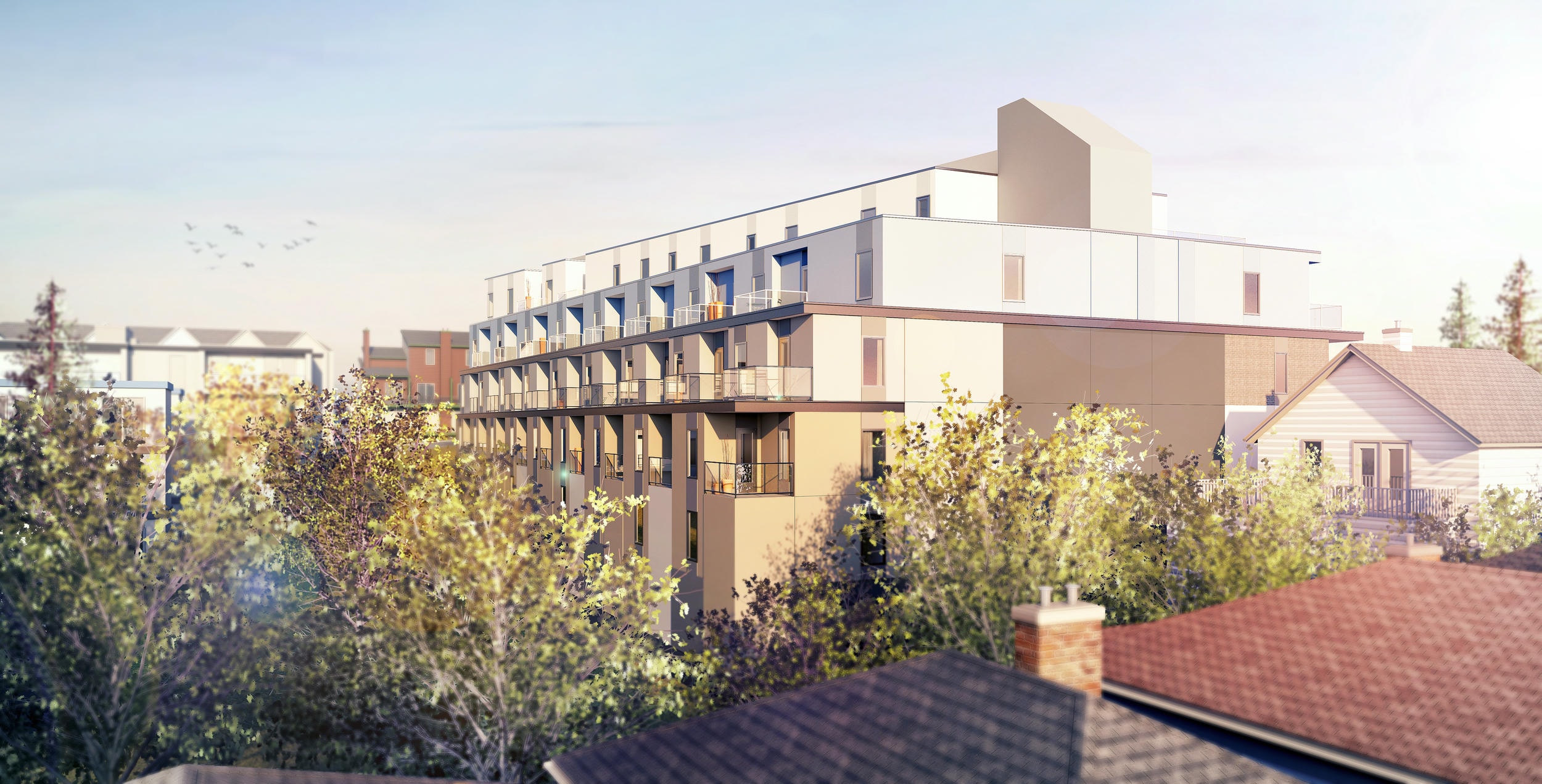 In addition to the stepback, material transitions across the facade are designed to consider transition with its neighbors to create a scale appropriate addition to its context.