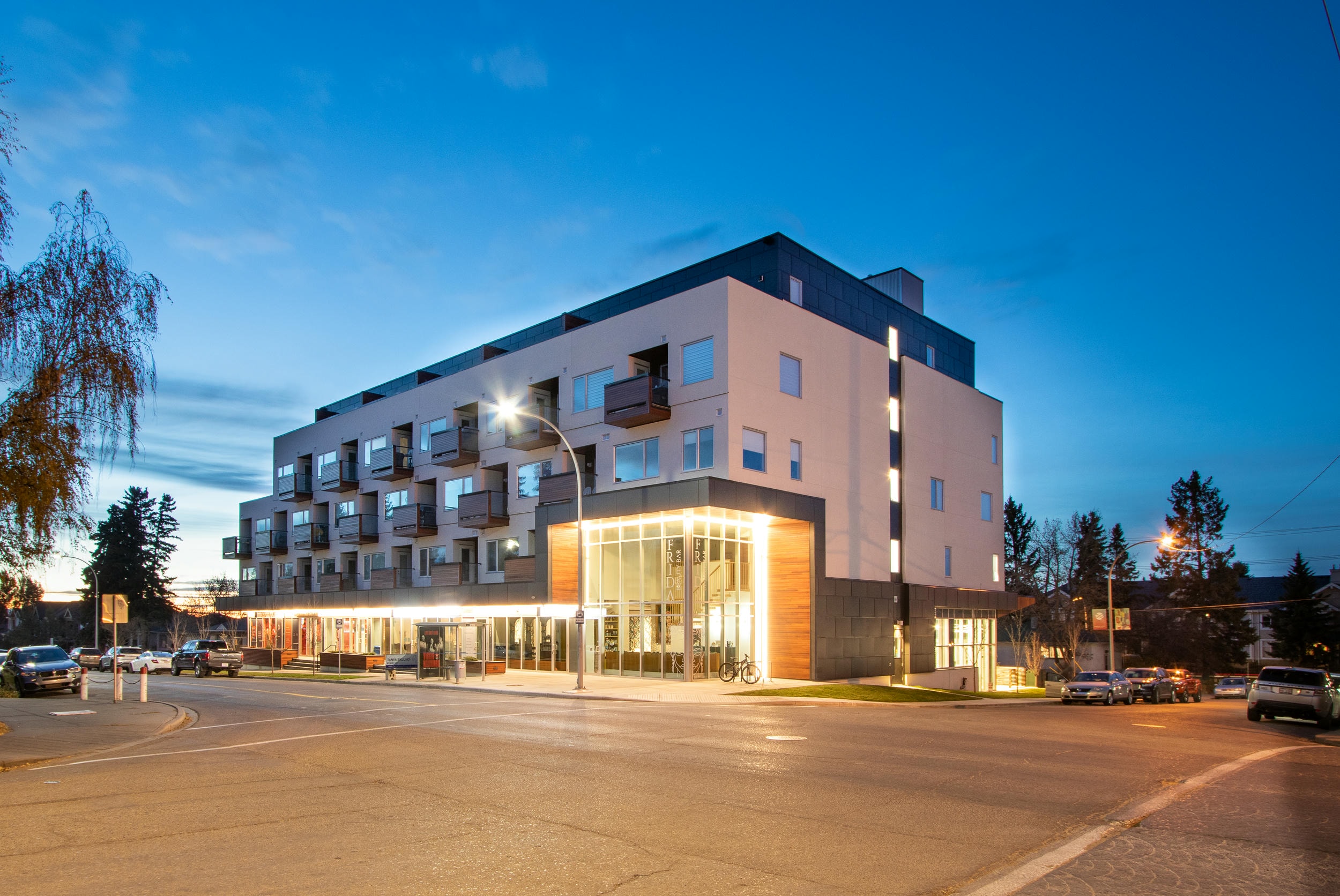 The project entails 42 condominium units above 300 sqm of commercial area. Located in the community of Marda Loop, this site is located on a busy pedestrian corridor facing commercial activity on the north and residential conditions on the south. The façade responds to the dual conditions through materiality, massing, and unit exposure. The units to the north are programmed with urban-type lofts facing the city, while the south has residential condominium-type floor plans.