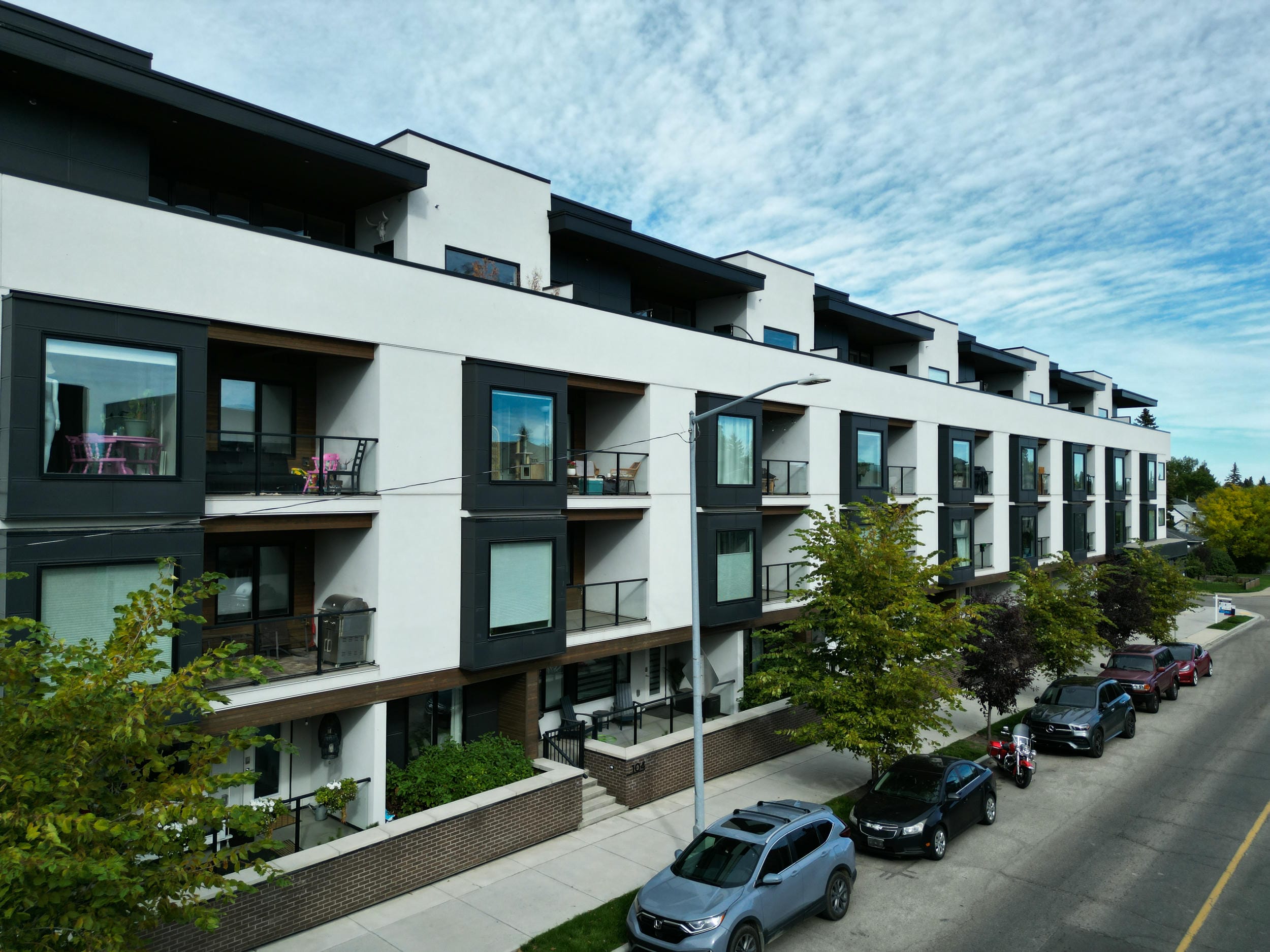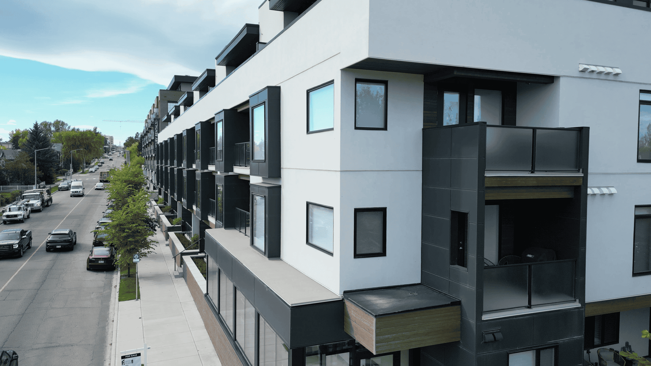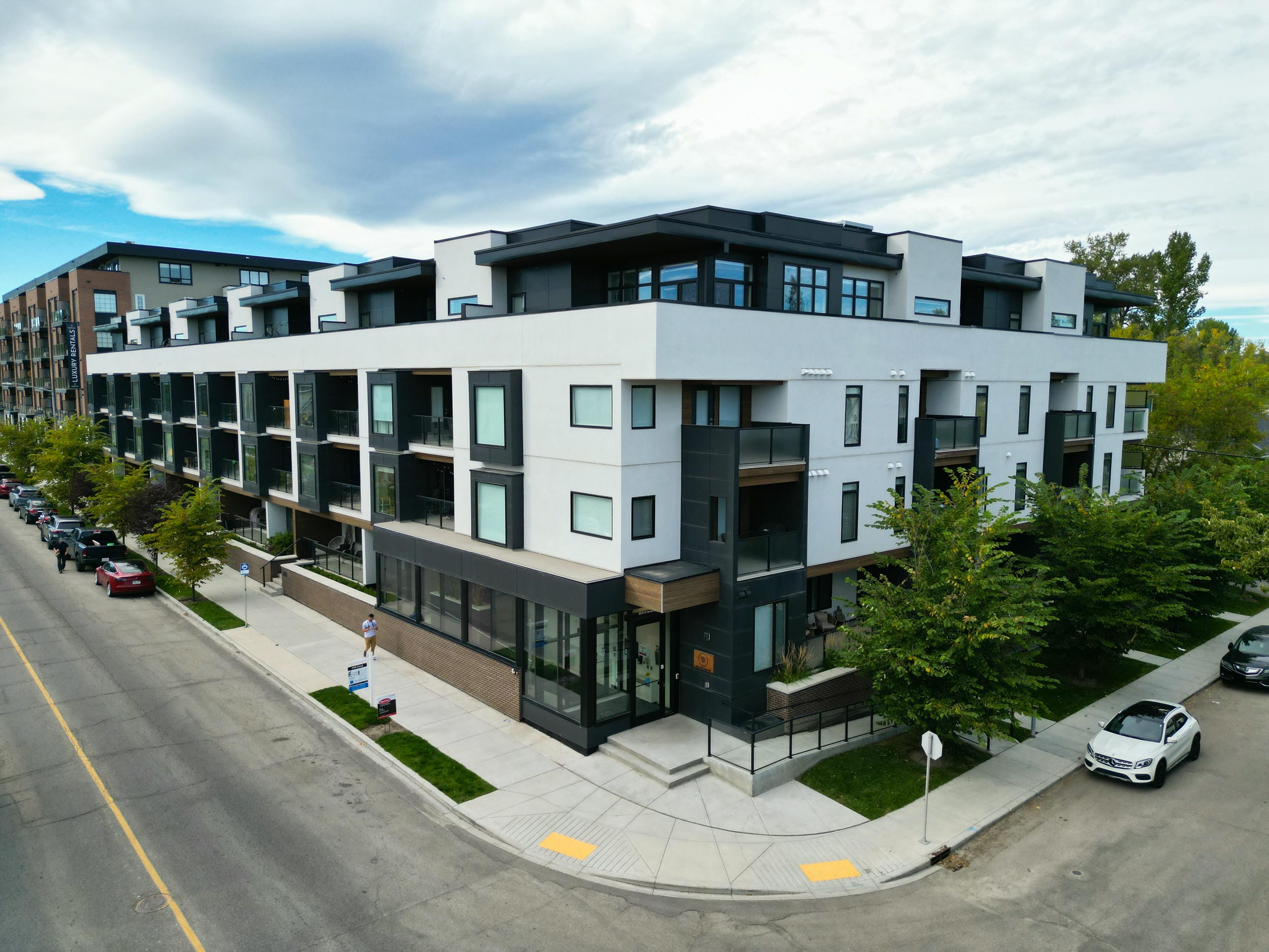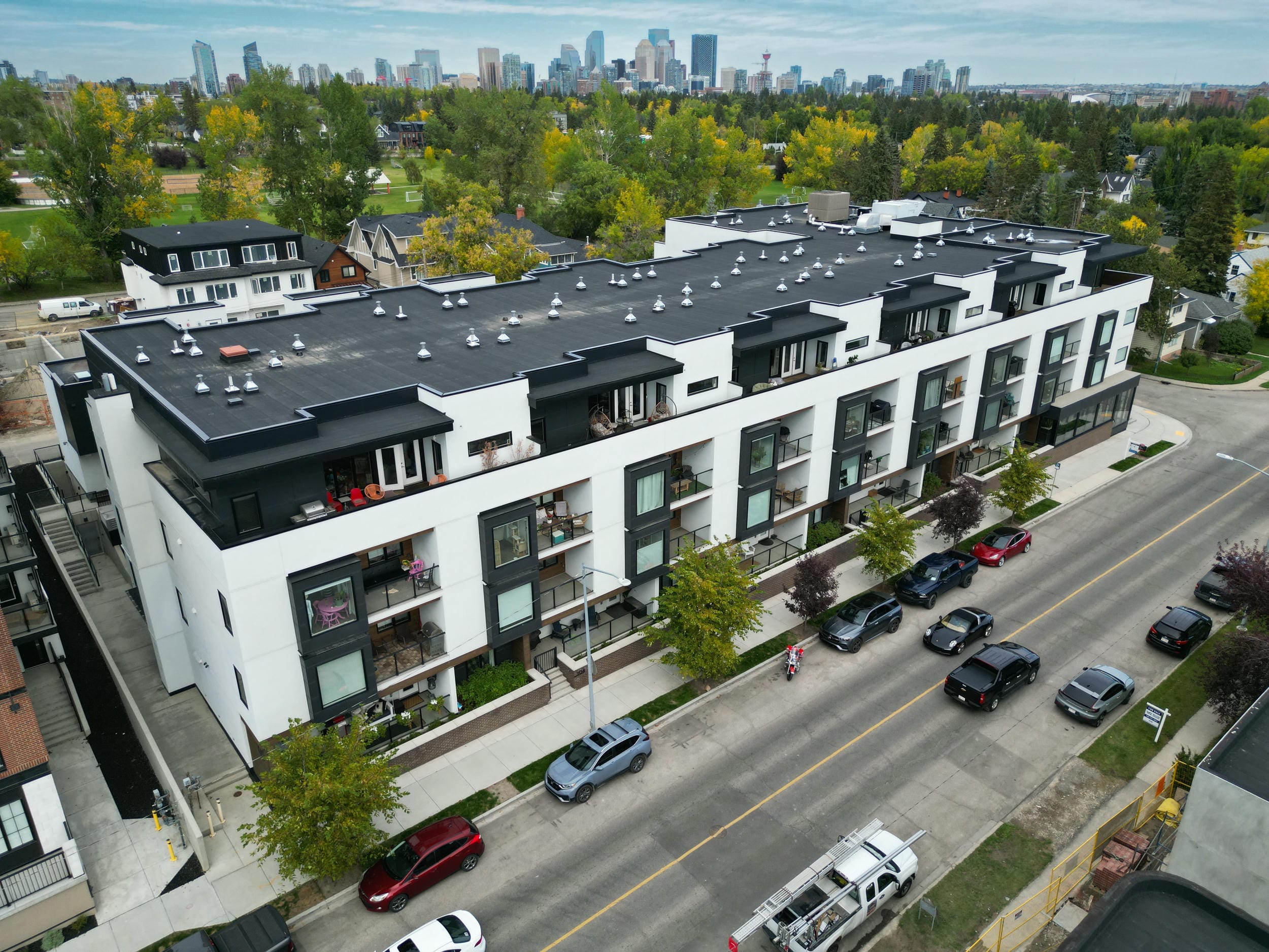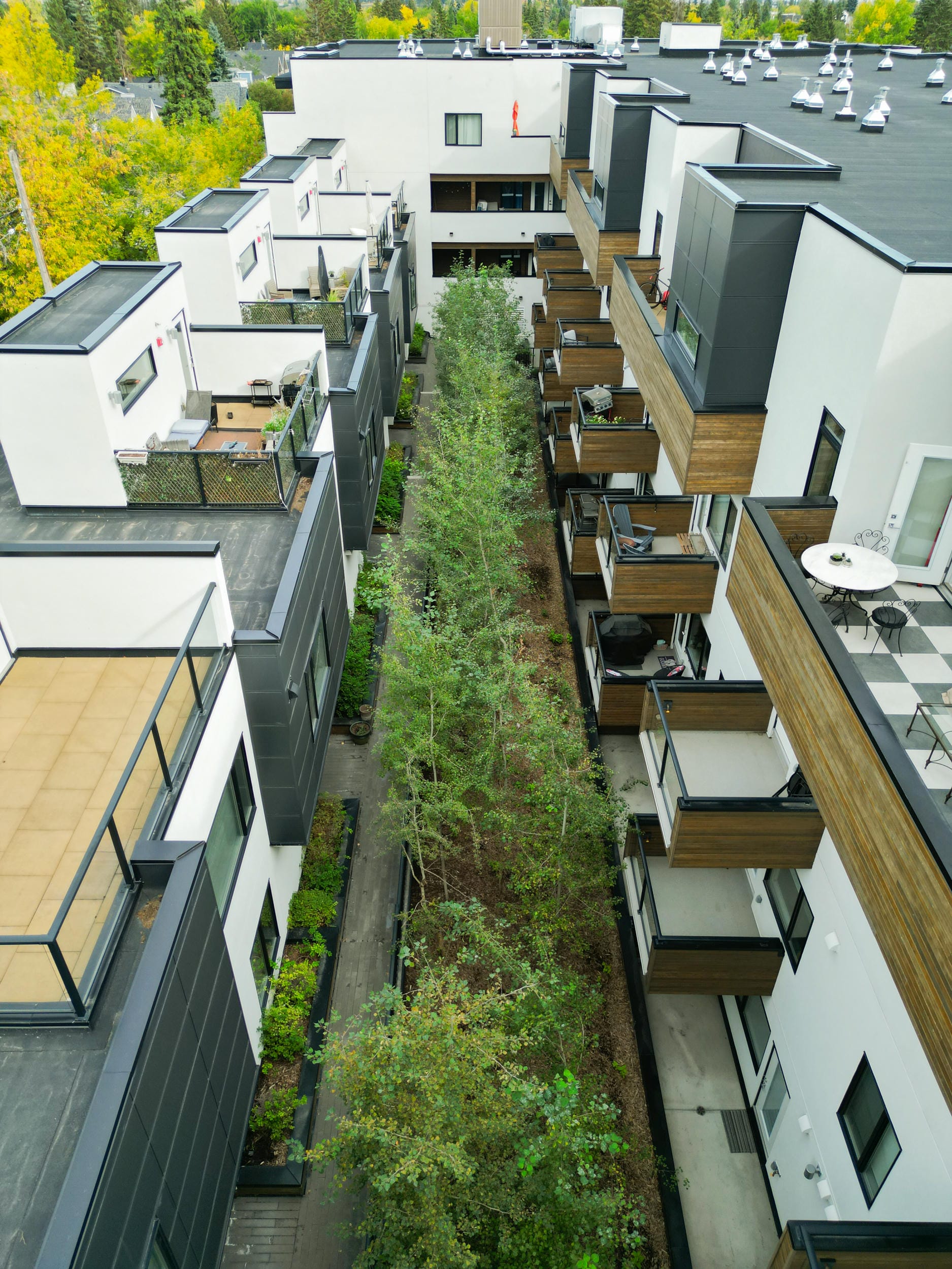 The project has been designed to provide sensitive solutions to integrate into the developing context of 33rd Ave SW. Identified by the City of Calgary as a future Main Street site, 33rd Ave SW is envisioned as a key location for careful densification. The scale of the proposal is consistent with these future goals, while simultaneously adopting design strategies to address the existing urban context. The project consists of 67 suites and 5 townhomes with attached garages and is designed around a public garden. The public courtyard acts as amenity space for residents as well as providing landscape screening between units to create privacy with units facing the courtyard.