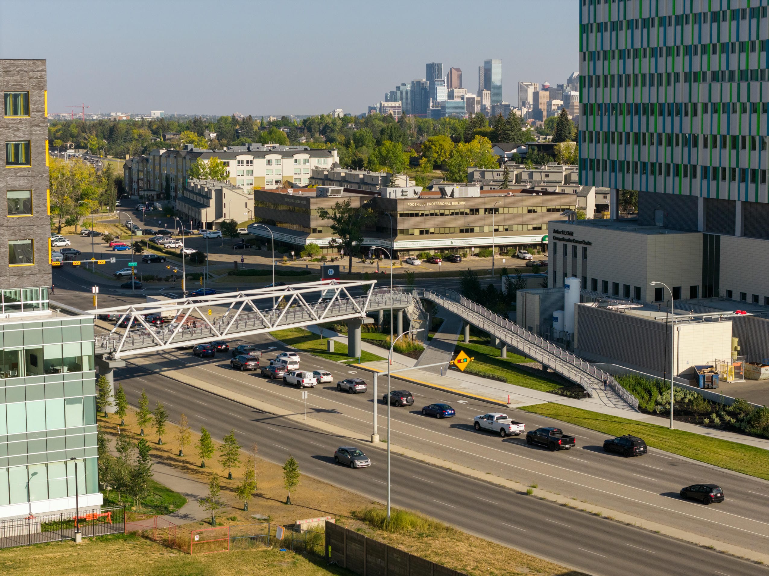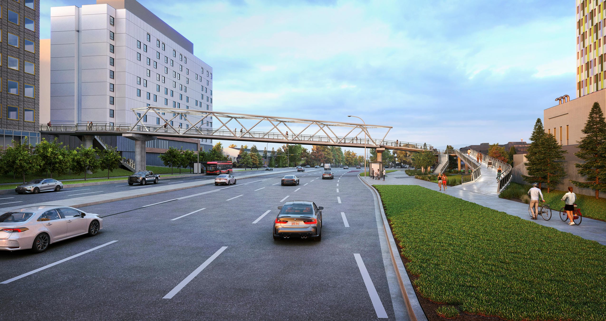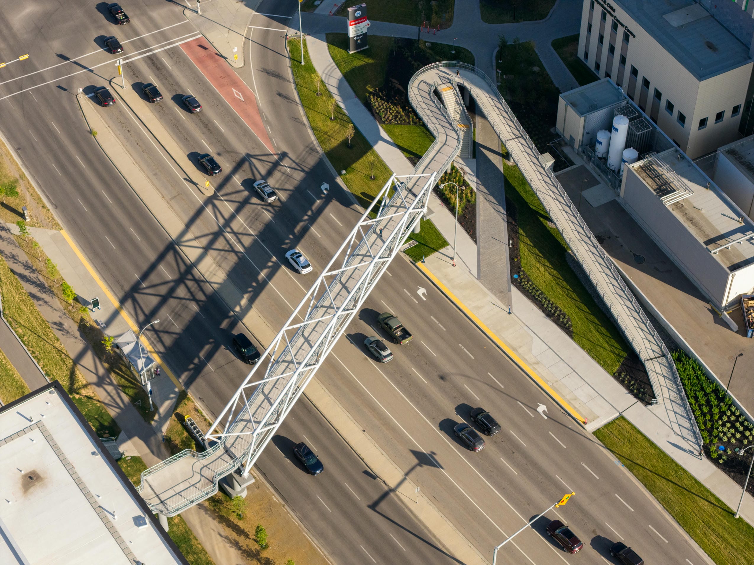 The Stadium Bridge project is a central component of an expansive urban revitalization effort in northwest Calgary and aims to increase the connectivity between the North and South regions that are currently split by 16th Avenue. Currently, 16th Avenue acts as a significant barrier amid high-density population and employment zones. Surrounded by major developments on both sides, the project aims to seamlessly integrate a visually captivating and functionally effective pedestrian bridge, fostering a pedestrian-friendly environment with a strong emphasis on transit and active transportation. The goals and the key benefits for the bridge aim to increase connections to regional pathways, increase pedestrian and cycling movement, increase access to the north crosstown BRT and to facilitate access to both the Foothills Medical Centre and UXBorough (stadium) development. This innovative bridge design aligns seamlessly with its urban context while supporting pedestrian access, creating connections in the community. The use of box trusses, rounded columns, and chamfered ramp edges not only responds to the human scale but also contributes to a visually refined infrastructure. The project’s commitment to legibility, vibrancy, and resilience further solidifies its role as a transformative element, enhancing connectivity, accessibility, and the overall urban experience in northwest Calgary.